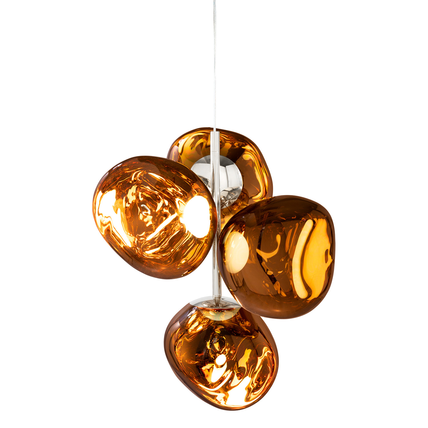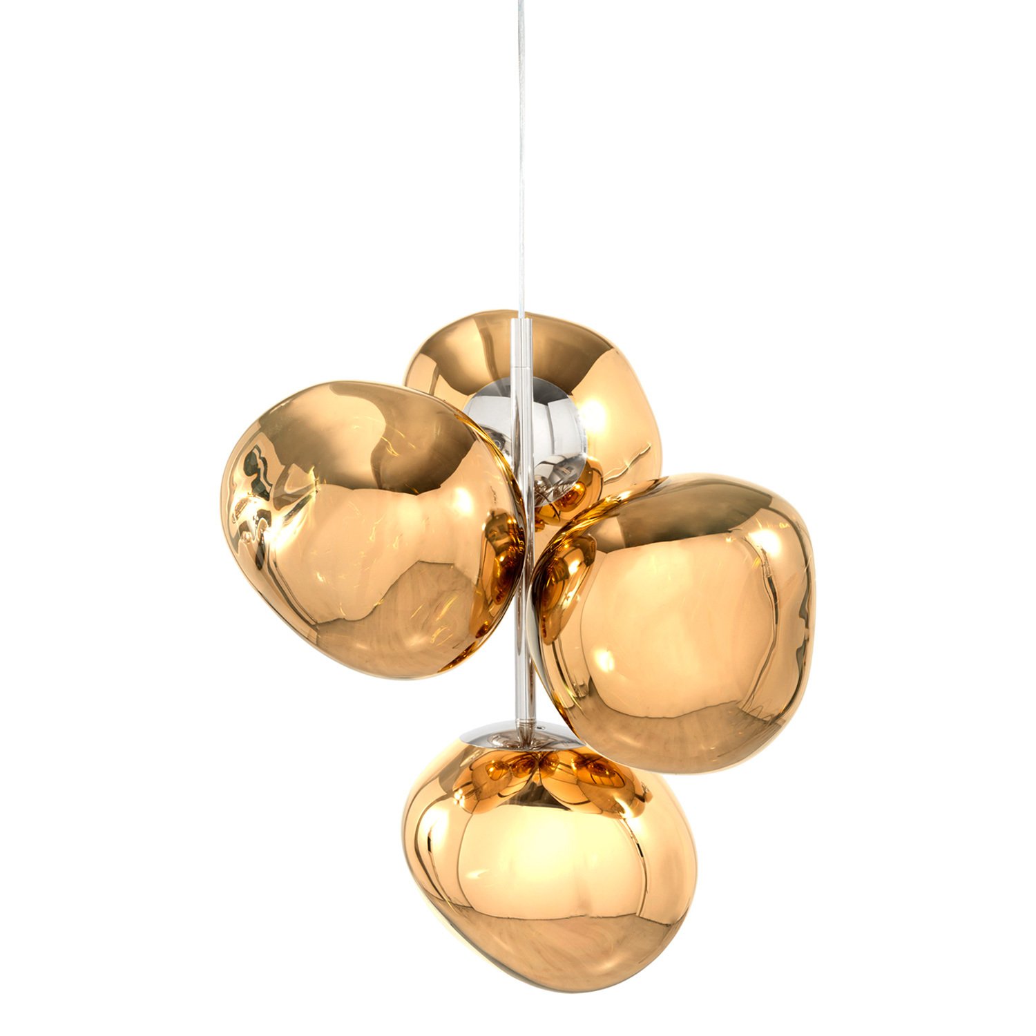 La lampada a sospensione Melt Chandelier Mini di Tom Dixon è stata progettata in collaborazione con il collettivo di designer svedese Front. Quando è spenta, Melt ha una lucente finitura a specchio e la sua superficie irregolare riflette la luce in modo affascinante. Solo quando è accesa o alla luce del giorno, la lampada diventa traslucida e crea l’illusione di un vetro fuso. Melt Chandelier Mini è composta da quattro sfere che creano un’affascinante versione moderna del lampadario.