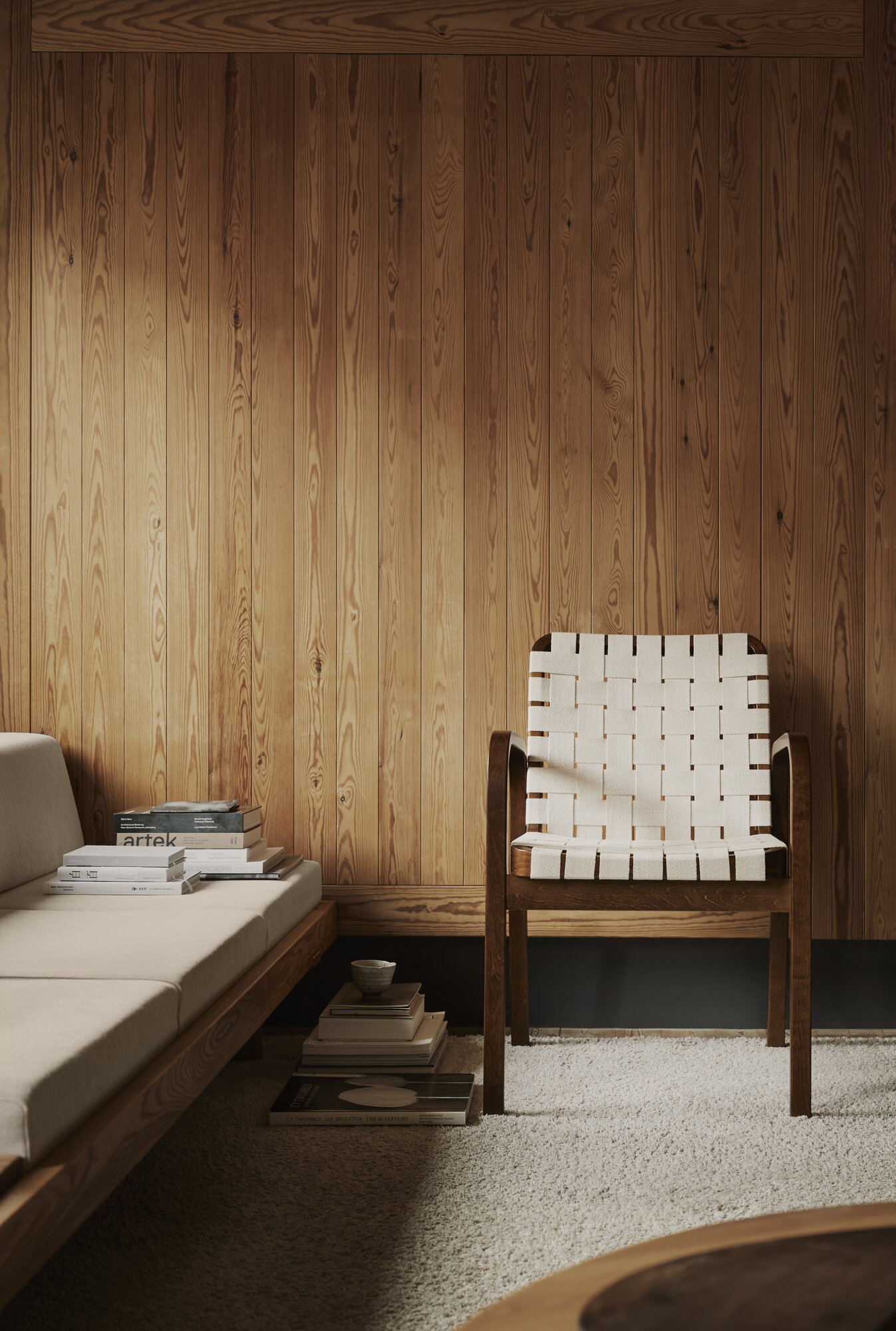 Nella versione aggiornata della poltrona 45 di Aalto, uscita nel 2024, le dimensioni sono state adattate per soddisfare gli standard odierni. Il sedile e i braccioli sono stati leggermente rialzati e l'angolo di seduta è stato regolato per una postura più eretta. Il design iconico rimane fedele alle sue radici, invariato dove conta perché l'eleganza funzionale della poltrona 45 risplende ancora negli interni moderni. In questa versione, la struttura della sedia è realizzata in betulla tinta noce.