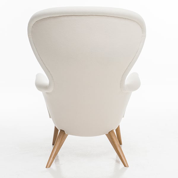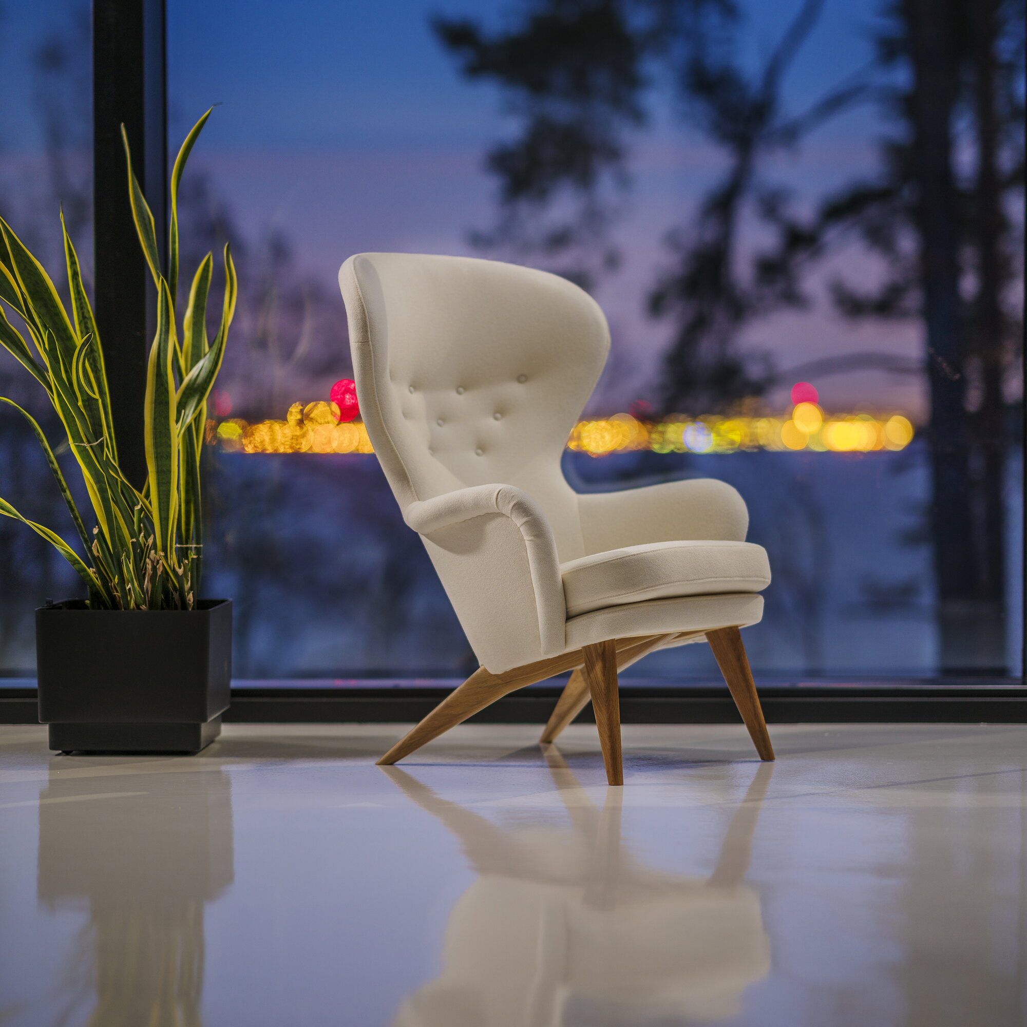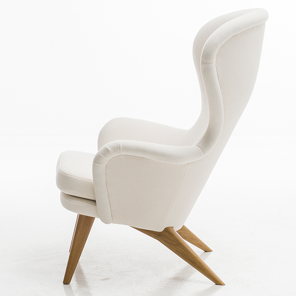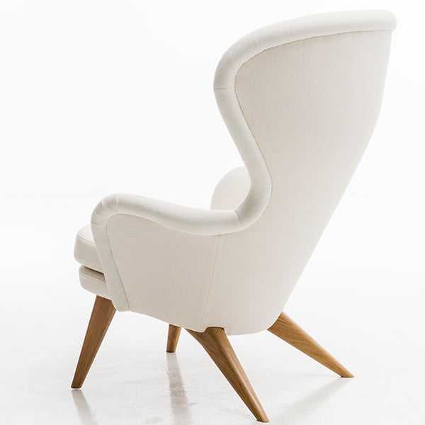 L’elegante poltrona Siesta è stata disegnata da Carl-Gustaf Hiort af Ornäs nel 1952. La poltrona ha una forma scultorea caratterizzata da uno schienale alto e gambe oblique in legno. La struttura è realizzata con un singolo pezzo di compensato pressato e il rivestimento dello schienale è rifinito da bottoni decorativi. La poltrona Siesta è stata presentata alla Triennale di Milano nel 1957 e fu originariamente prodotta dalla fabbrica di mobili di Hiort af Ornäs stesso, Puunveisto Oy, a Helsinki, Finlandia. Oggi, la sedia disponibile è una riedizione.