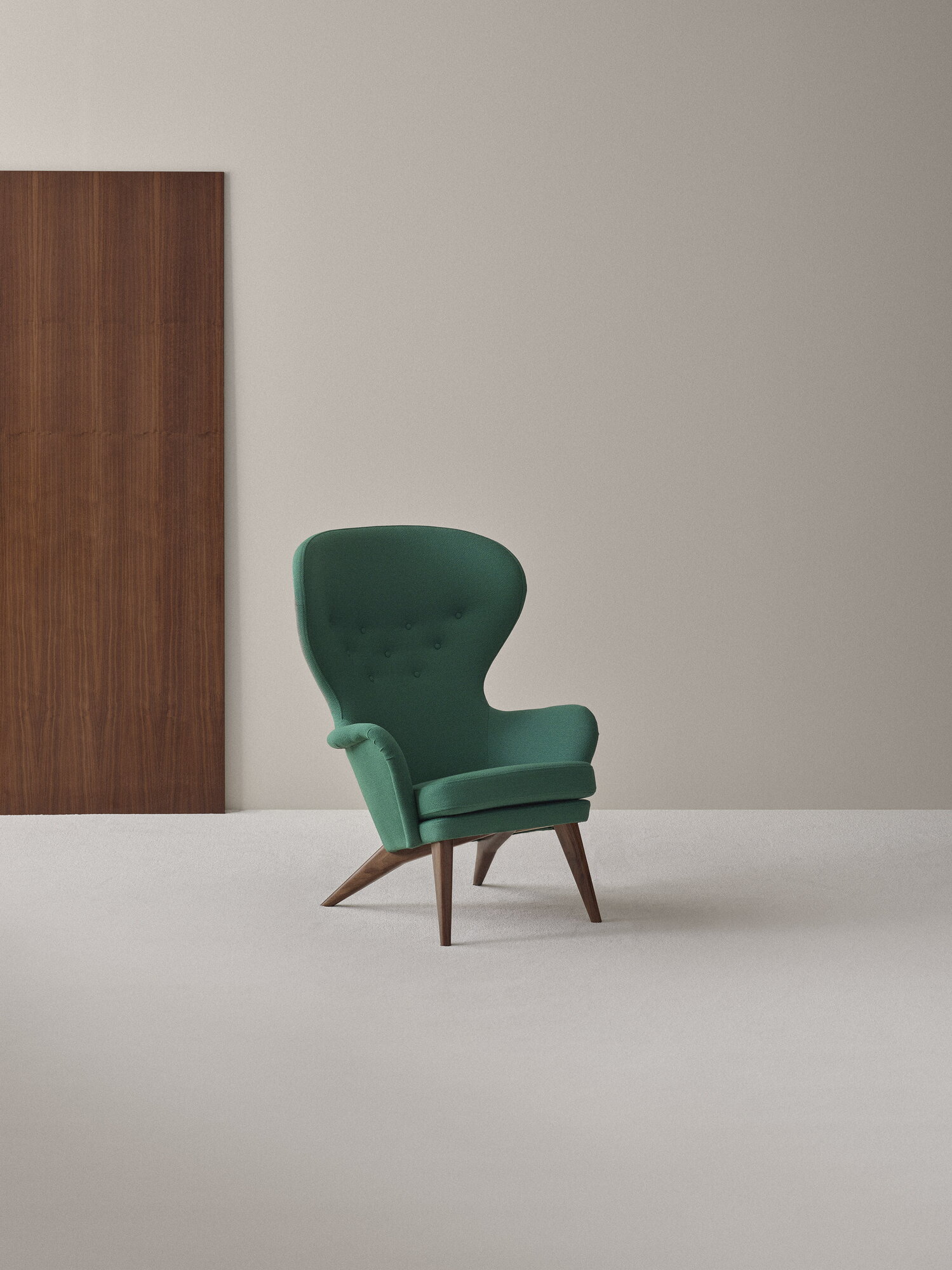 L’elegante poltrona Siesta è stata creata da Carl-Gustaf Hiort af Ornäs nel 1952. Questa seduta attira l’attenzione con la sua forma scultorea, caratterizzata da uno schienale alto e da gambe inclinate in legno. Il telaio è realizzato con un unico pannello multistrato di legno compresso e il rivestimento in nero dello schienale è rifinito con bottoni decorativi. La poltrona Siesta è stata presentata alla Triennale di Milano nel 1957 e in origine veniva prodotta nella fabbrica Puunveisto Oy di Hiort af Ornäs a Helsinki, in Finlandia. La sedia attuale è una riedizione.