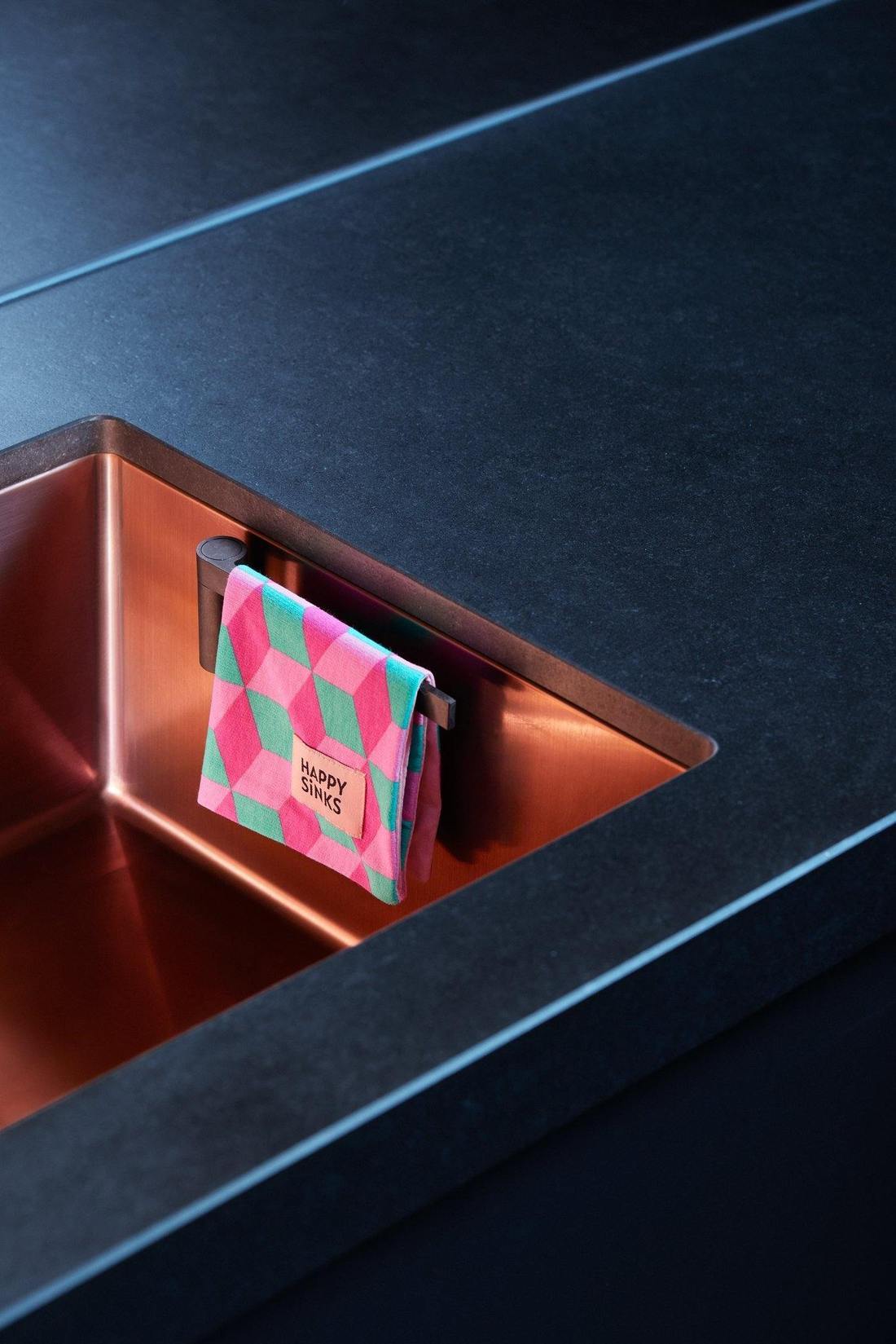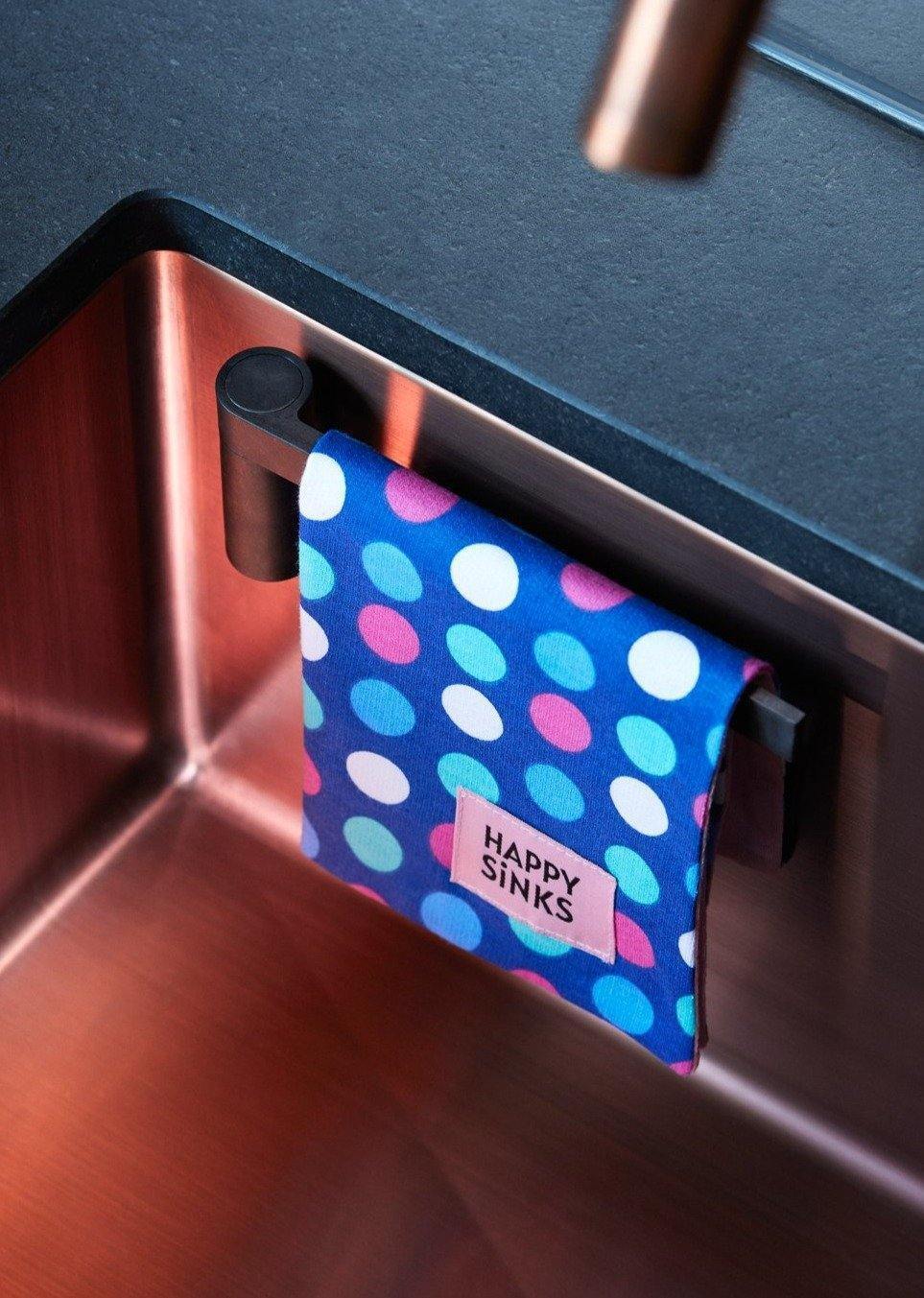 Il porta panni spugna Happy Sinks consente di appendere comodamente i panni spugna a lato del lavello. In questo modo, i panni si asciugano velocemente, in modo igienico e non dovrete più riporli sul rubinetto. Il supporto magnetico rotante è facile da fissare a qualsiasi lavello in metallo senza l’utilizzo di attrezzi. Il porta panni spugna è adatto anche per lavelli in materiali compositi con uno spessore massimo di 5 mm.